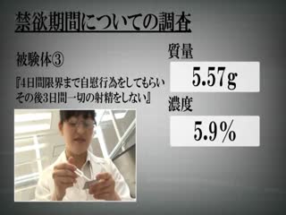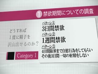 Overview: SODがエロに関する謎や疑問を科学的に実験・検証を行う研究機関を本社に設置!研究員女子社員達が身体を張って真面目にエロ研究に勤しみます。第一弾は『精子を一度に大量に出す方法は?』。3名による手コキ・パイズリ・素股等々で精子をサンプリング、飛び・濃さ・味を追究し、大量射精を生み出す方法を導き出します。