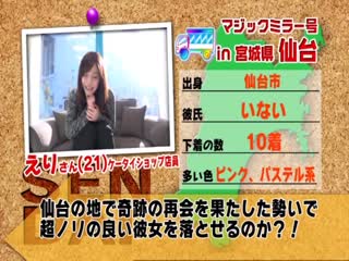 소개: SOD専属候補となる美少女を探すマジックミラー号日本縦断の旅、第2弾は東北ナンパの聖地「仙台」。イルミネーション輝く冬の仙台で、今回もナンパを始め、あらゆる手段で東北出身の純朴美女を大量捕獲!簡単なインタビューだと思ってやってきた7名が恥じらいながらも脱ぎ、内6名がSEXまでする様は必見です!